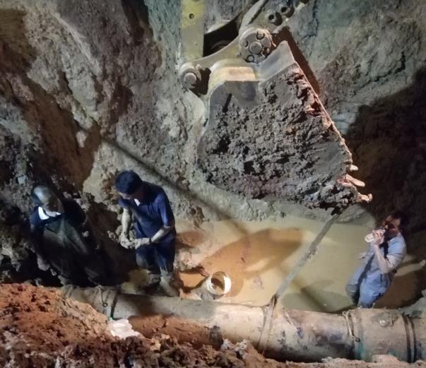 7月11日,员工们正在为暴雨带给盐卤车间水平衡问题发愁时,又一个坏消息传来。经现场确认,我公司位于药都南大道距露天球场北面200米处的外排冷凝水管漏水。向公司领导及相关部门汇报紧急情况后,盐卤车间紧急部署,启动应急抢修方案。