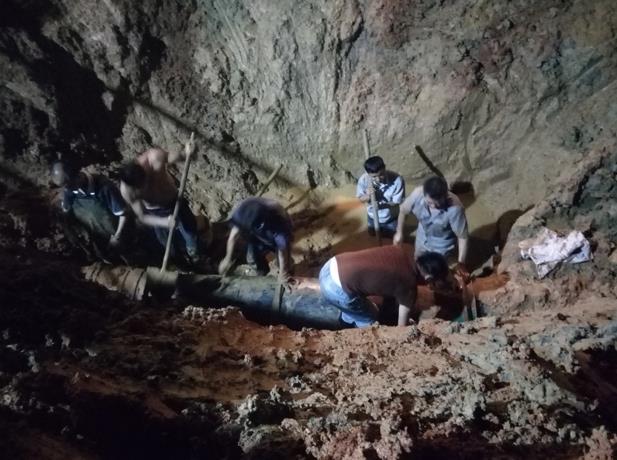 就在此时,抢修人员又发现距管道切口大概50厘米处还有一条裂缝,另外一端距切口30厘米处同样有一条裂缝。此时大家的心情再一次失落起来,一个个用布满血丝的眼睛你看看我,我看看你,没有言语只有叹息。因为之前按照测量的外表看得到的裂缝只有1.5米,现在外表看不到的内部裂缝延伸到将近3米长,也就意味着准备好的新管道用不了,且坑内还要再次开挖、切割。再加上盐硝车间冷凝水一直未排,现在罐内积压的水位已经快到极限。抢修工作迫在眉睫,必须抓紧时间抢修。此时陈国华和熊漉颖亲自动手重新做好准备工作,其余人员也一个个打起精神加入工作中去。直到13日凌晨2点抢修工作全部完成,虽然在凌晨1:30分时再次下起了暴雨,但是大家克服困难、顶着压力,齐心协力完成最后的收尾工作。