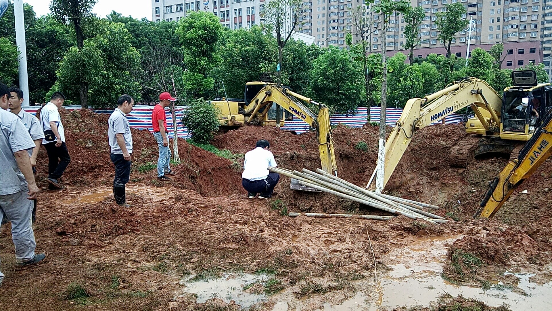 11日下午,盐卤车间组织抢修队伍到达现场进行抢修。但是管道距地面有6米多深,再加上樟树市委相关部门及管道正上方就是军用光缆、泥土被雨水浸泡等层层困难,给挖掘、抢修带来很多难题。但是盐卤车间清楚面对困难不能退缩,也没有理由退缩。每个人都认真仔细,抢修现场井然有序,大家齐心协力,面对一个个难题。常务副总经理余茂良、生产部部长陈涛及盐卤车间班子成员在现场对这些问题反复探讨,全面剖析。同时与樟树市委相关部门密切协调,最终决定采用钢管、模板防止塌方,军用光缆用钢管支撑,遇到暴雨时如有人员在坑底作业,应立即撤离,管道漏点用哈夫节堵截,施工现场周围用帆布围挡,同时坑内如有积水用三相污水泵排水,且水应排至防洪堤坝外。决定一经做出,盐卤车间班子成员密切协调配合,大家发扬不辞辛劳连续作战的精神,迅速制定了操作方案,兵分几路,全面落实部署的工作。一场与时间赛跑、与恶劣天气抗争、与意志较量的大战拉开了序幕。12日凌晨1点,管道漏点终于显露在大家视野中。但是,天有不测风云,就在此时天空一道仿如白昼的电闪雷鸣把大家的喜悦突然击入冰冷的水底,豆粒大的暴雨再一次降临,刚刚露出的管道瞬间被雨水及泥土淹没,而且还有泥土不断垮塌。大家站在雨中,神情无比的憔悴和失落。暴雨持续到凌晨4点多才慢慢停止,此时坑内积水和泥土又与地面持平,而且还不断有积水从坑内向外冒。大家继续用污水泵排水、开挖,直到下午2点多才清理出基坑,但是大家发现管道漏点不止一个,跨度最少有一米五。最后车间决定把一断管道全部切除,加一节管道,用两个哈夫节连接。方案一确定,大家立即分工合作,有切割管道的,有准备新管道的,有负责排水的,有负责发电的,有负责现场协调指挥的。经过大家团结协作,在下午5点一切工作准备就绪。