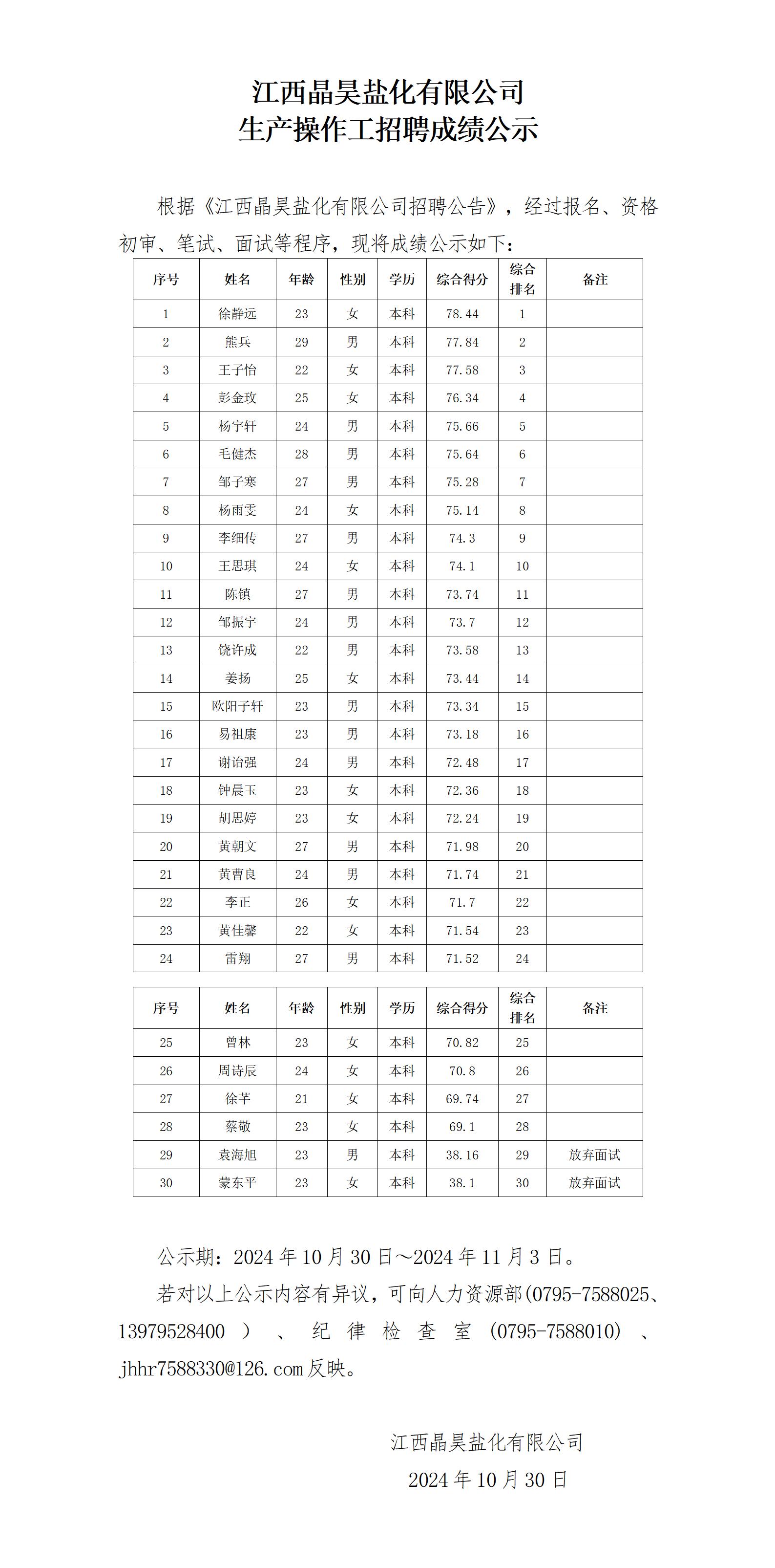 新利18官网生产操作工招聘成绩公示