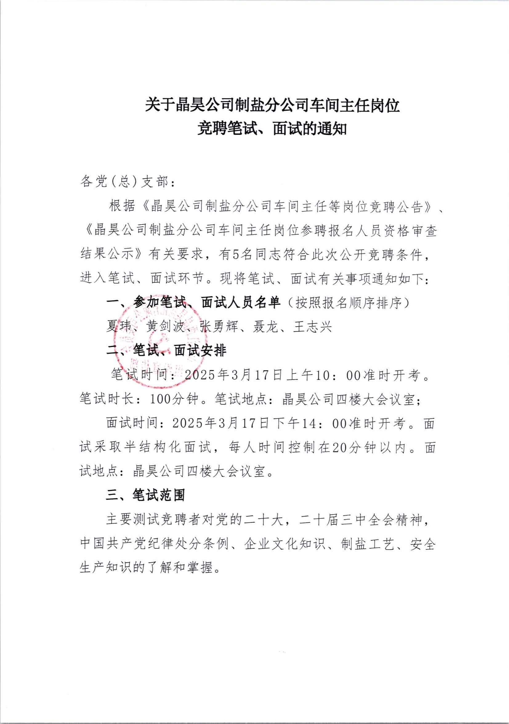 关于zzxzls公司制盐分公司车间主任岗位竞聘笔试、面试的通知