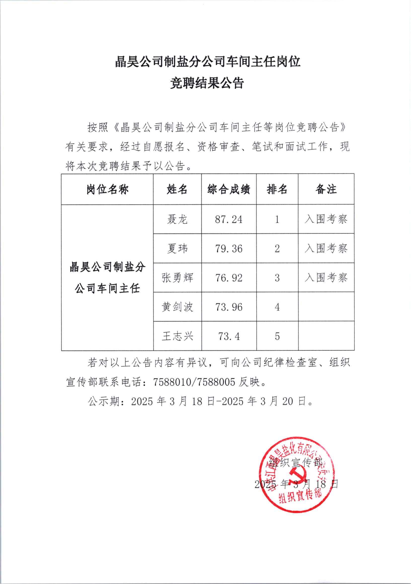 zzxzls公司制盐分公司车间主任岗位竞聘结果公告